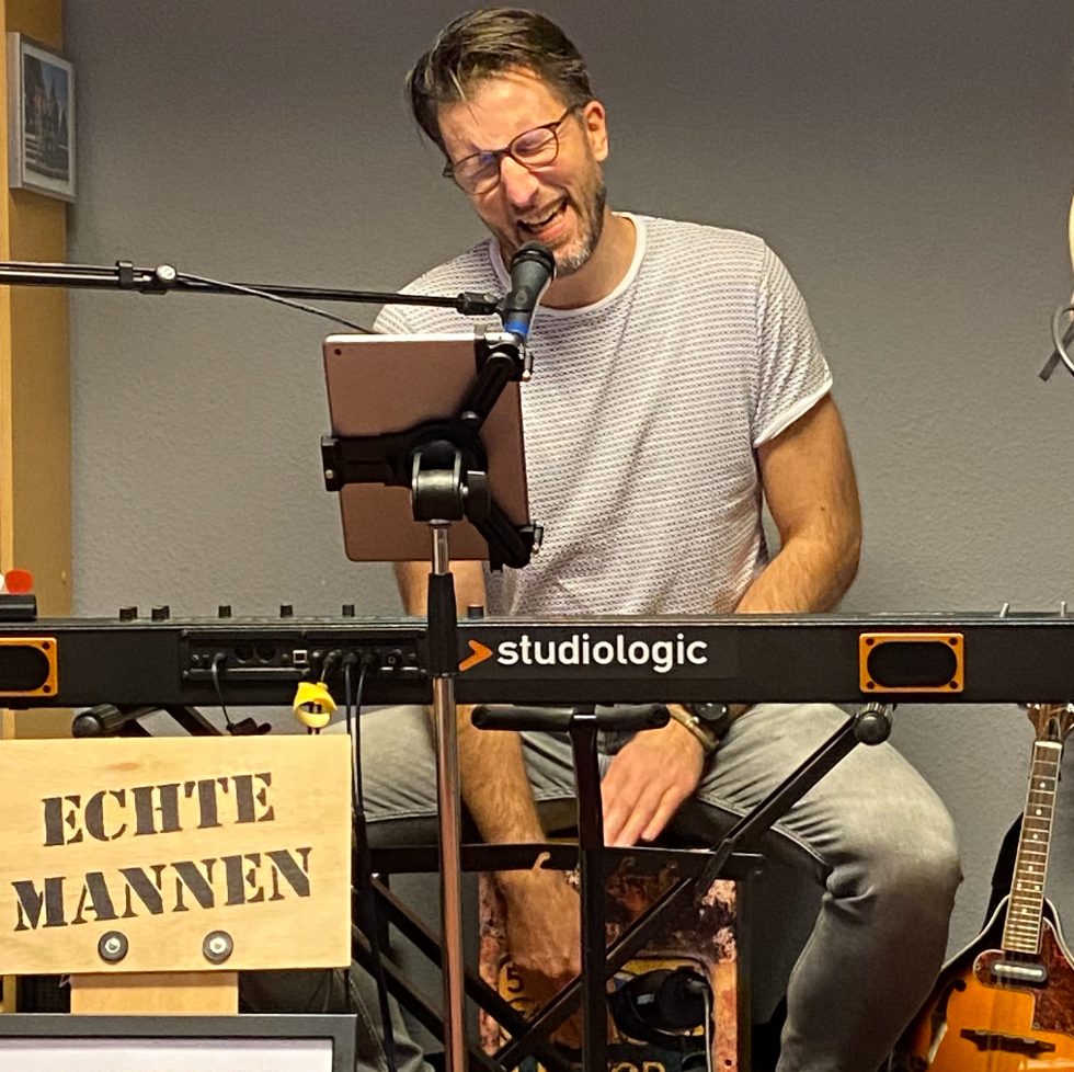 Echte Man 3 Frank Oeben (1979, Utrecht, toetsen, cajón, percussie, loop station, mandoline, bas, gitaar, kazoo, zang): ‘Vereerd om als “Echte Man” al mijn instrumenten in te mogen zetten om de liedjes de muzikale invulling te geven die ze verdienen.’